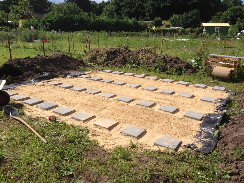 Obwohl das Fundament nicht wirklich tief ausgekoffert werden musste, war es dann doch erstaunlich, welche Mengen Sand in dieses "kleine" Loch passten. Zumindest waren meine Arme am Abend gefühlt einen halben Meter länger, nachdem Schubkarre für Schubkarre vom Hauptweg bis zur "Baustelle" befördert wurden. Schlussendlich wurden über 5 Tonnen Sand versenkt um eine vernünftige Grundlage fürs spätere Häuschen zu schaffen. Denn nur so kann Kondenswasser, was sich gegebenfalls unter dem Boden der Hütte sammelt abtropfen und versickern. Um die Feuchtigkeit von unten ebenfalls zu regulieren kamen auf das Sandbett nun Gewegplatten um eine Erhöhung für die späteren Fußbodenbalken zu schaffen. Durch entsprechende Lüftungsbleche an den Seiten konnte nun die Luft so zirkulieren.